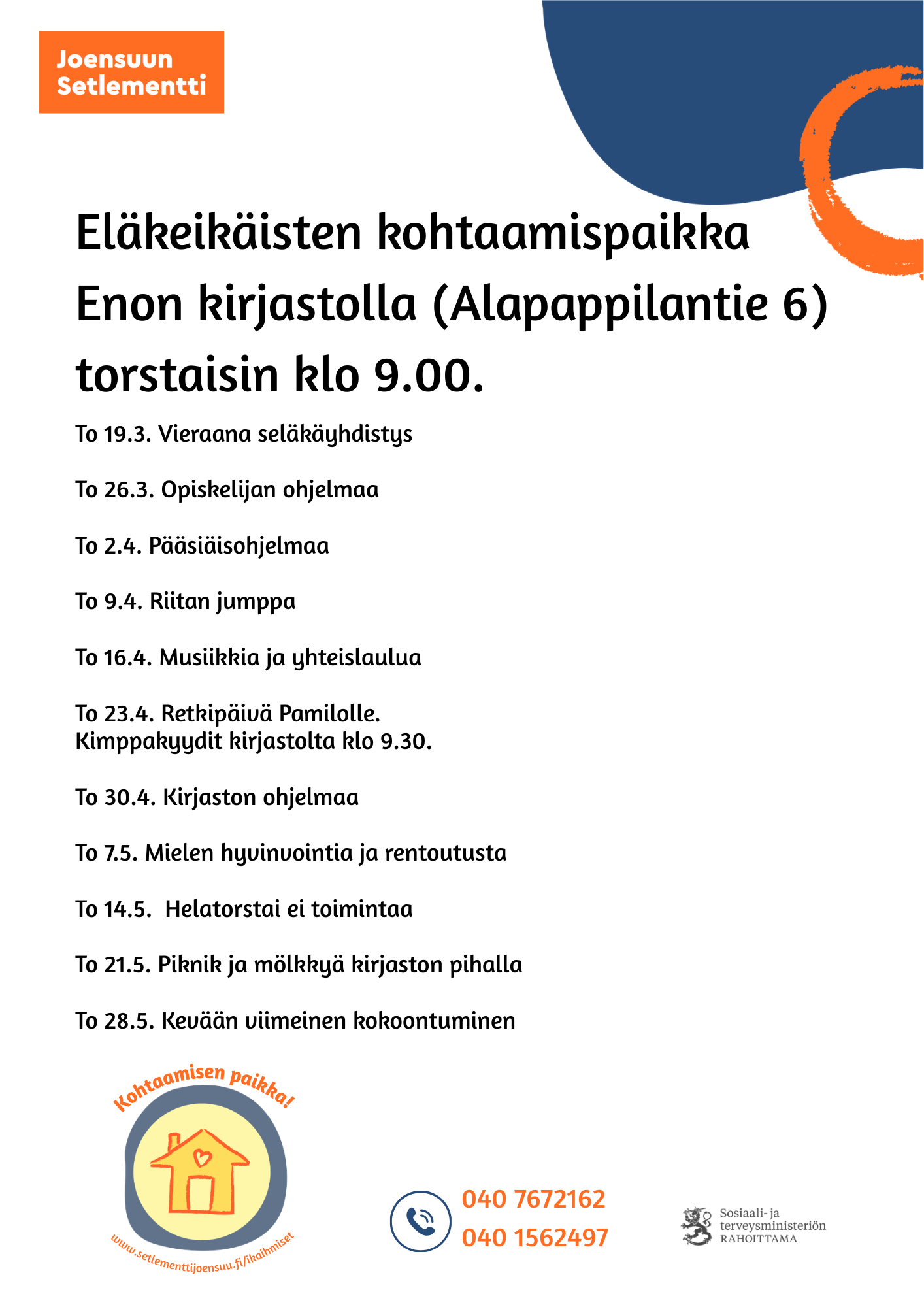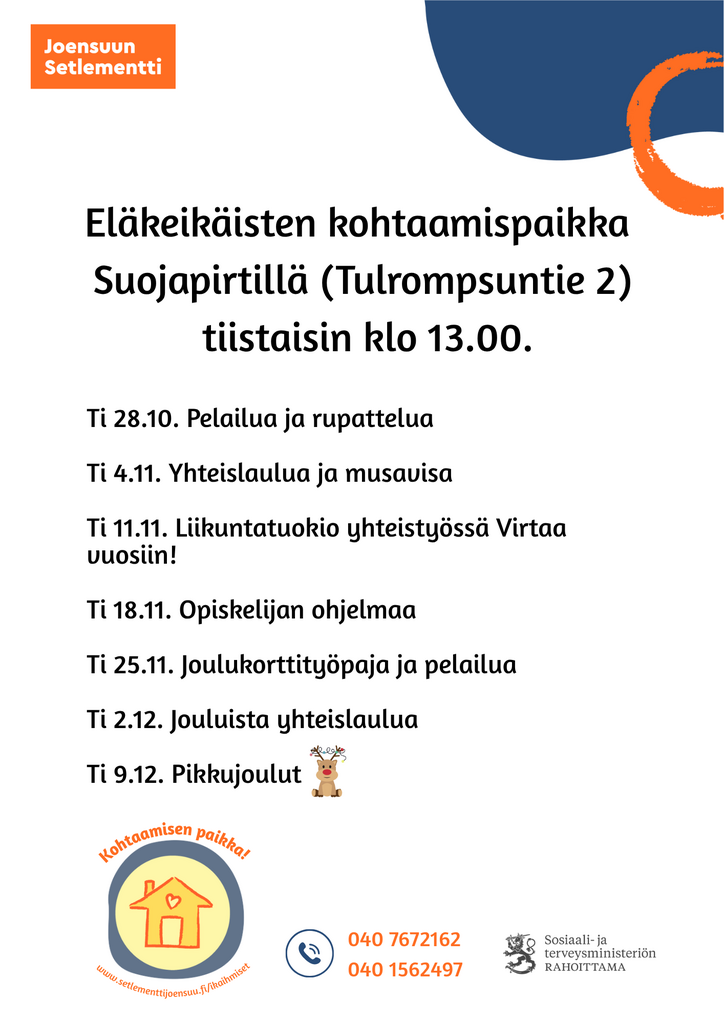 Eläkeikäisten vapaa-ajan toimintamme on koettu mukavaksi paikaksi, jossa voi kohdata ihmisiä ja kahvitella. Haluamme suunnitella monipuolisia sisältöjä ihmisten kanssa yhdessä, mahdollistaa uusia kokemuksia ja tartumme ajankohtaisiin aiheisiin. Tärkeintä on olla luoda kohtaamispaikka, jossa kaikilla on mukava ja hyvä olla. Toimintamme on kaikille avointa, maksutonta ja ei vaadi sitoutumista. Voit käydä ryhmässä silloin kuin sinulle sopii!