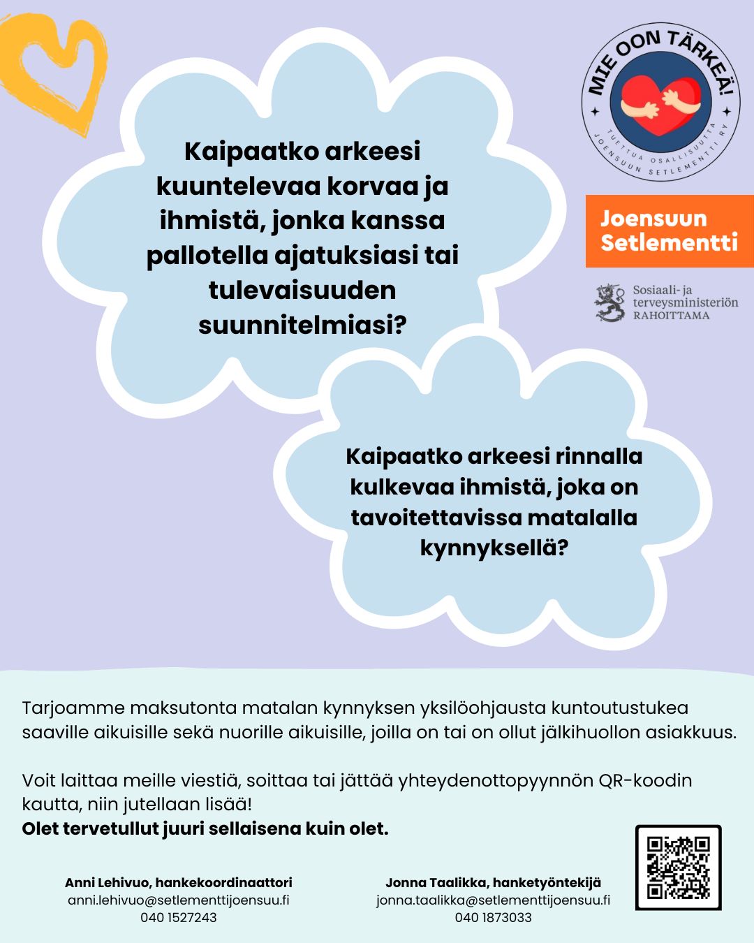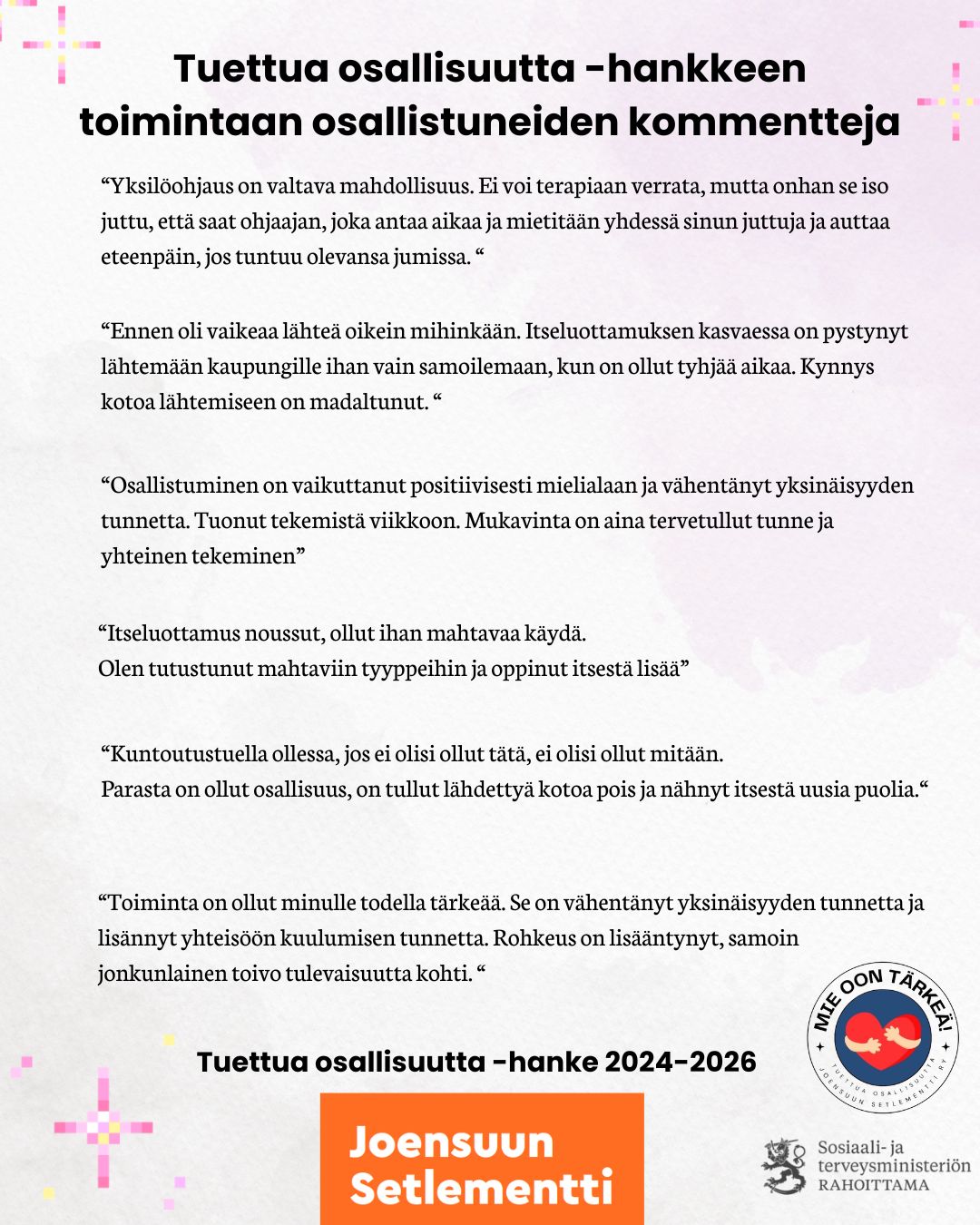 Tuettua osallisuutta (2024-2026) -hankkeessa vahvistetaan jälkihuollon nuorten ja kuntoutustuen piirissä olevien henkilöiden arjen osallisuutta, kyvykkyyttä, merkityksellisyyttä ja vaikutusmahdollisuuksia osana kokonaisvaltaista hyvinvoinnin lisäämistä.